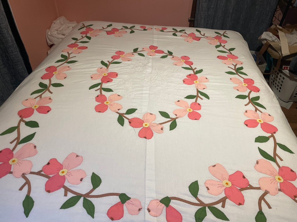 I only have two more flowers and two more branches to hand sew before I can start embroidering the commissioned quilt again. All in all I have had a very productive week so far. I’m proud that I have gotten quite a bit of the items that I wanted to do complete. There are other things that I really do need to get working on, putting things onto my Etsy site, seeing about getting a couple of quick makes to set up an in person craft booth sometimes this summer, and so much more. At present the weather is going to be really hot and then thunderstorms so I don’t think I’ll be doing too much outside…though I did finally get my lawn back under control.
