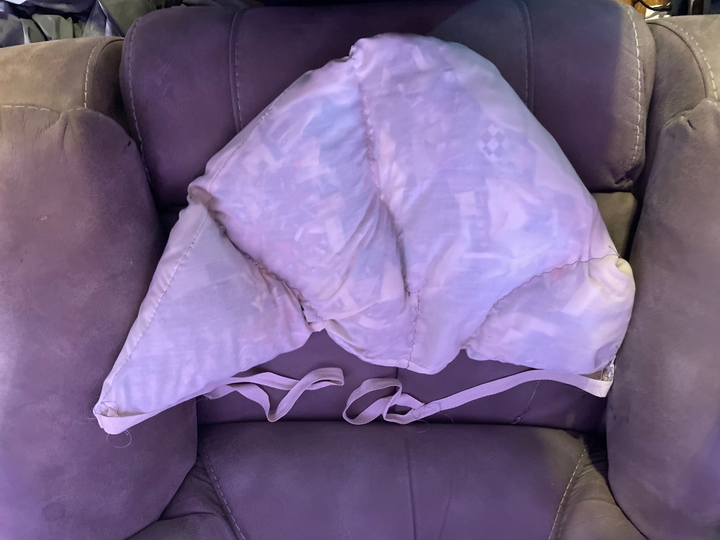 I also managed to finish a garment which is one of the few garments where you would ask your significant other ‘Does this make my butt look big enough?’ I am going to be playing the part of a mother from 1880s who is in mourning. I’m trying to put together a costume with minimal purchasing so I used an old pillowcase that I stuffed with fabric scraps and sewed in a semi circle. I then sewed a few lines to roughly keep the stuffing in place before adding in some twill tape to use as ties. This is not how you should make this garment if you want it to last and look really authentic. For a quick job this is an alright result. It will cover my entire backside and give my hips a little more padding. I’m going to try to put together my rough costume this upcoming week to see if it all works.