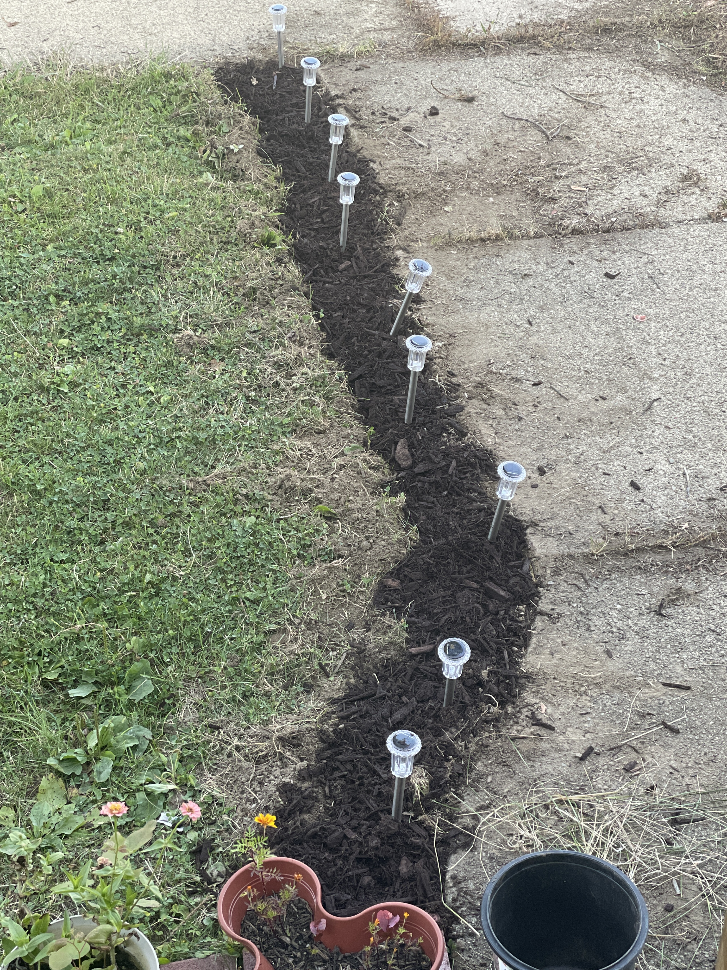 I finished making my lighted walkway look a bit better. In about an hour I used a tined weed remover to loosen the grass and dirt along the path. After that I removed the grass and put it on my compost pile, the dirt went into some flower pots that were lacking in soil, I’ll see if I can plant something there next year. After that I used black weed preventing cloth that I staked down with my lights. After the cloth was laid down I added the rest of the lights and a bag of brown mulch. My grass doesn’t look bad enough for me to worry about mowing so I’m not going to bother just yet.