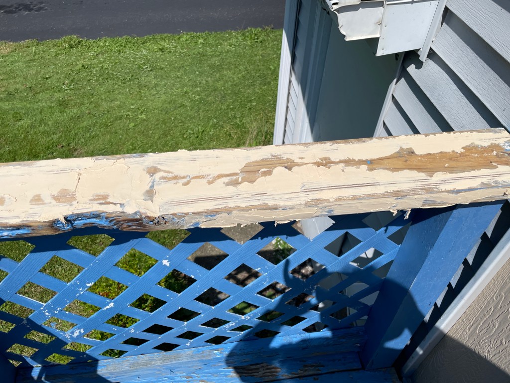 I am still working on getting rid of the grass between my sidewalk slabs, so please ignore that. I did try to get some of the spaces on my front porch fixed up, I’m going to wait a bit to see if it looks better before I take photos. I did another two hours of sanding on my back porch. I like how the porch is looking so far. I did some filler on the other railing and sanded down the first set of filler.