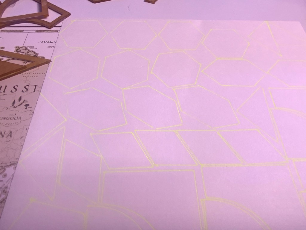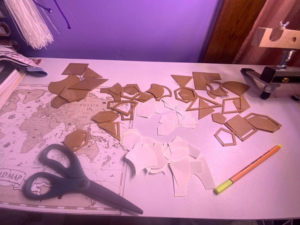 Once I had the traced them out I used scissors to cut out each shape. Later I am going to have to use the larger outer template to cut the fabric. I will be using a rotary cutter, being very careful to not cut myself.