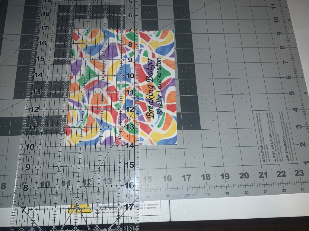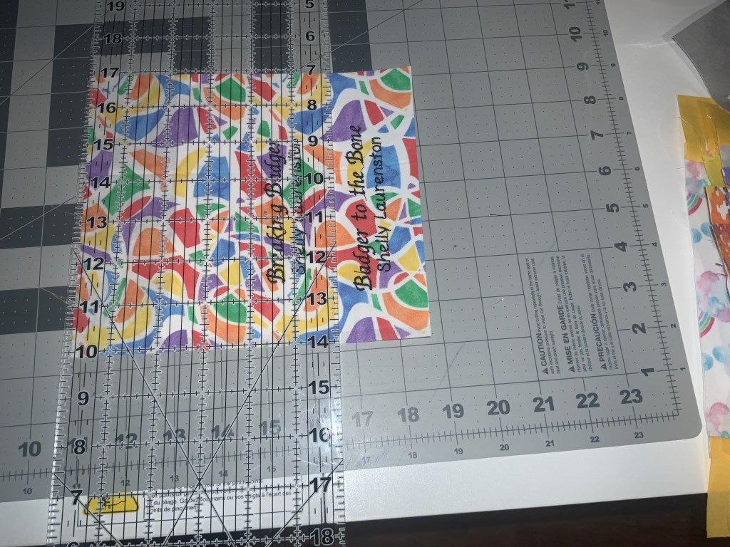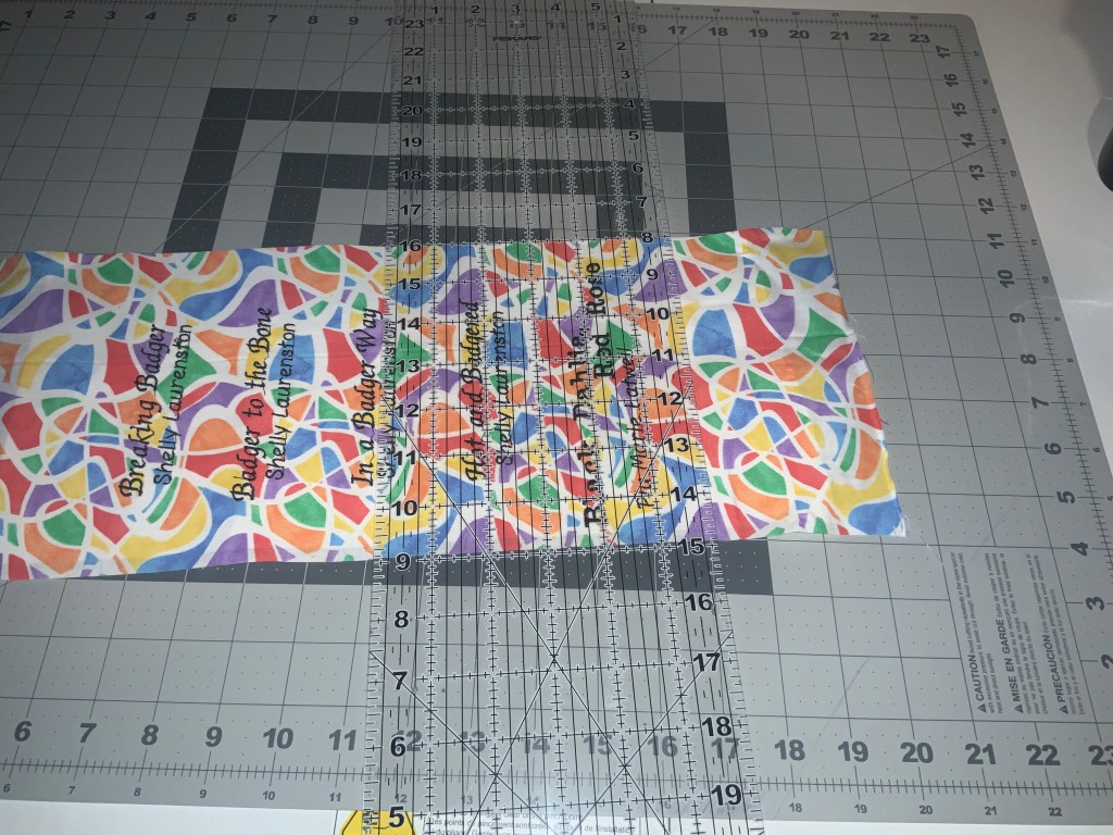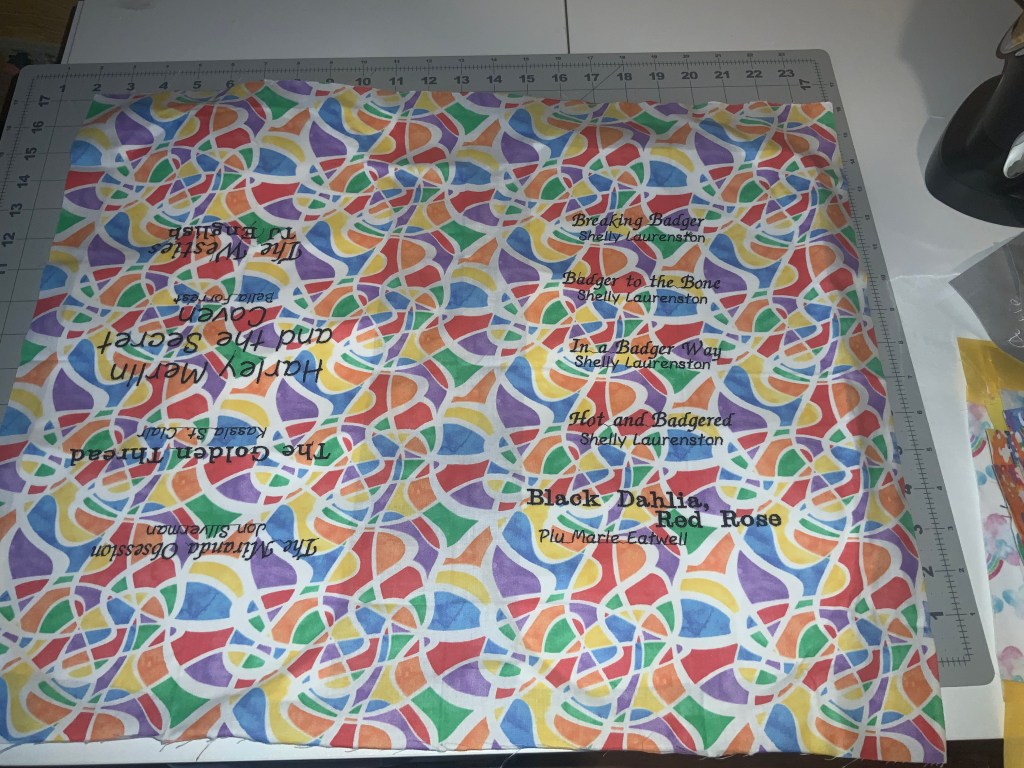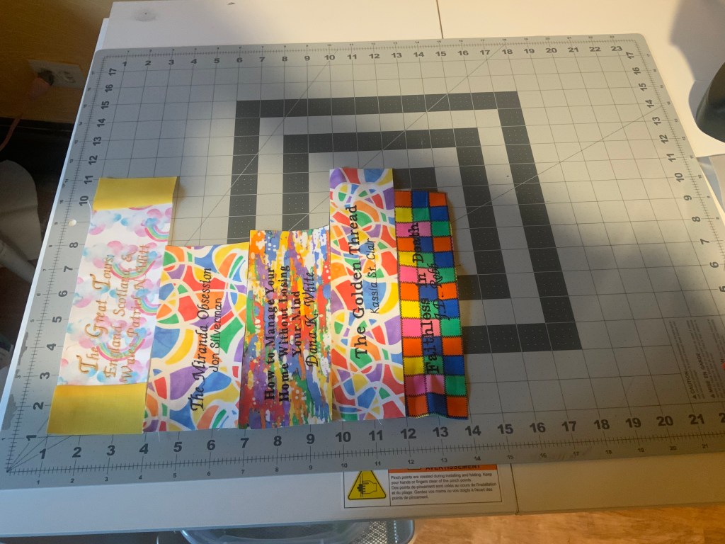 Since I do not like changing the thread, I decided to ensure that there were at least one or two other books in between each so that I will not have a huge chunk of the same color spines. There are a couple of series that I decided would be OK if they are the same color, so that is why all of my Shelly Laurenston books are on this fat quarter. I have decided to give myself about half an inch to an inch around each spine so I measured that out and cut each one out individually.
