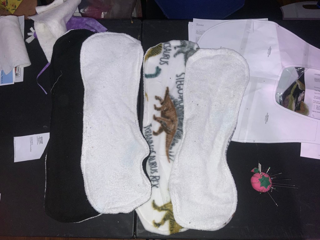 The burp cloths are made with terrycloth on one side and fleece on the other. I finished the top stitching before work this morning. I still need to bury the threads, and run them through a wash cycle using Dreft. Once I have that finished these will be up in my shop. I’m thinking about selling them as a package; one dinosaur back, one black back for $5. It will be 2/$5, the only reason I can do that is because I managed to get the fabric as remnants so they were very inexpensive.