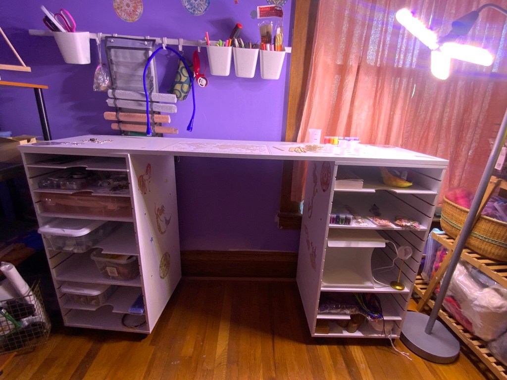 There is a cubby that I built years ago, not very well admittedly, that had been against a wall but hidden with items in front of it. That is now next to the loom against the wall, mostly accessible. There are 3 cubbies that have longer term storage items that I placed a small end table against. I then pushed my desk up against that end table to create a seamless corner of work space, where I can still access most of the cubbies, that I feel will be very functional.