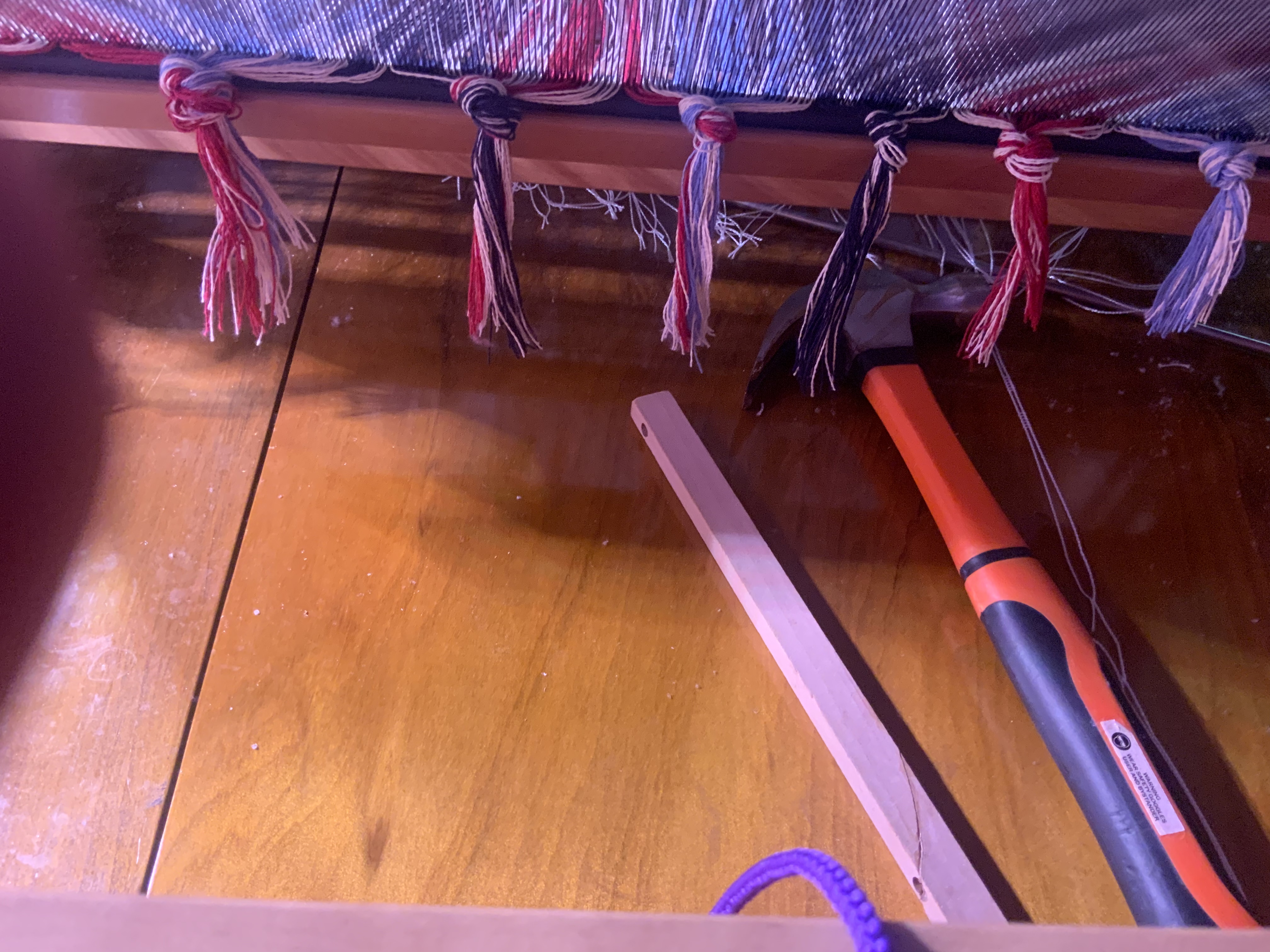 I know that the gorilla wood glue worked because after half an hour the shaft stayed together without the clamp on. I did manage to get all of the extra heddle off and shifted where the last shaft is going to be by adding the pieces onto the other heddle. Essentially now only the 16th shaft is missing the part that keeps the heddle rods in place. Do I regret doing all of this, while the loom is completely warped up, not really. Considering how much time and effort it takes to warp up the loom, loosening the warp from the back beam and allowing the heddles to shift in place seems to be the best way to do this. That being said, I have not found out where the sticky warps are nor whether anything is shifted or twisted, so wait and see if this actually works or not. Since I am having a Weaving Guild meeting on Saturday and they asked us to bring our own place setting, I’m going to wash the towel now that I’ve hemmed it and see how it works.
